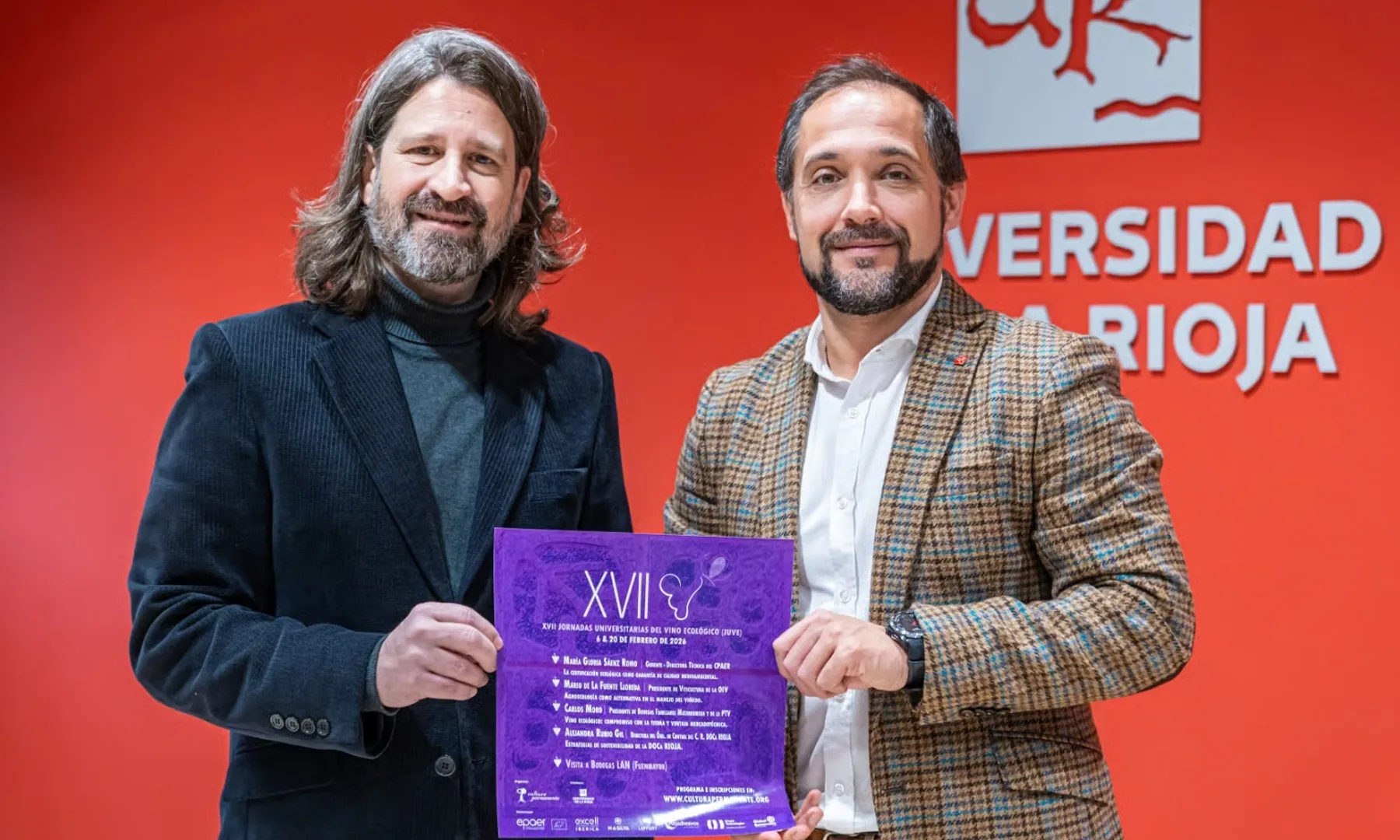 Las Jornadas Universitarias del Vino Ecológico (JUVE) celebrarán su decimoséptima edición con un programa centrado en la viticultura sostenible, la calidad enológica y el consumo responsable. La presentación estuvo a cargo de Eduardo Fonseca, vicerrector de Política Científica de la Universidad de La Rioja (UR), e Iñigo Crespo, presidente de Cultura Permanente y coordinador de las jornadas.