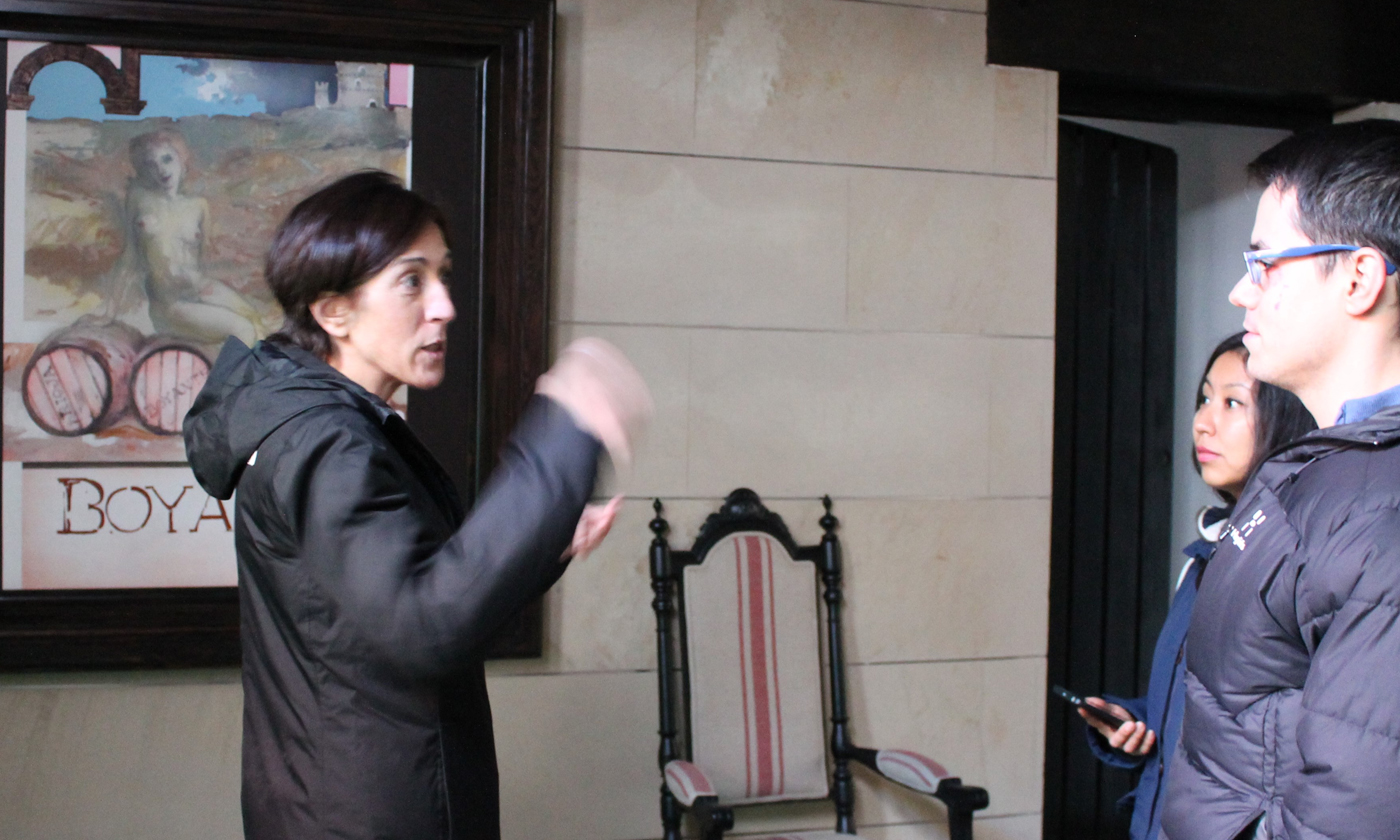 Afición común por la mitología.- Pasamos junto a una obra pictórica de Miguel Ángel Sáinz, el artista omnipresente en la bodega, que ilustró una de las primeras etiquetas de Ontañón con la marca ‘Boyante’ a mitad de los años ochenta. Leticia confiesa y demuestra su auténtica pasión por la mitología, describiendo en detalle la simbología del cuadro y de la imagen de la divinidad griega que representa. Apunta Ignacio que la mitología, afición que también comparte, está en las raíces de la transmisión del conocimiento.