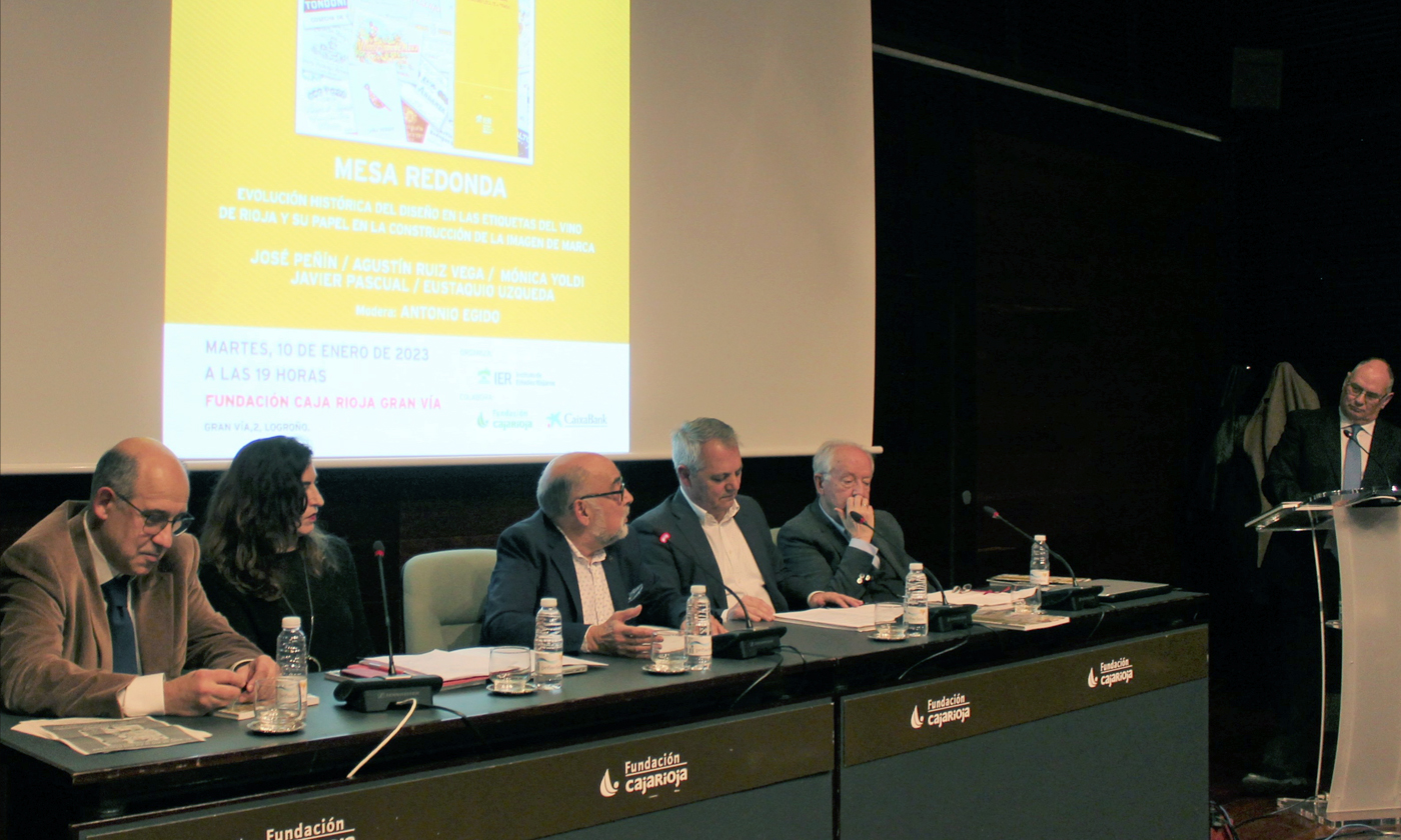Los expertos que han participado en la mesa redonda organizada por el Instituto de Estudios Riojanos para presentar el libro ‘El vino de Rioja en sus etiquetas’ han coincidido en el carácter pionero de este estudio, que analiza la influencia del etiquetado en la construcción de la imagen de marca de los vinos de Rioja. Junto a los autores, el periodista Javier Pascual y el pintor y coleccionista Eustaquio Uzqueda, el reconocido crítico de vinos José Peñín y los profesores especializados en diseño Agustín Ruiz Vega, de la Universidad de La Rioja, y Mónica Yoldi, de la Escuela de Diseño, mantuvieron un interesante debate sobre la evolución histórica de las etiquetas y su iconografía, moderado por el periodista Antonio Egido y presentado por la profesora y miembro del IER, Teresa Cascudo, responsable de la dirección académica del trabajo de investigación.