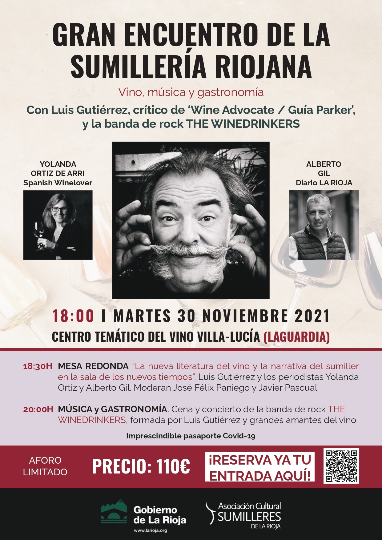 El programa del primer gran encuentro de la sumillería riojana que se celebrará el próximo 30 de noviembre no solo ofrecerá un debate de altura con el crítico de ‘Wine Advocate/Guía Parker’, Luis Gutiérrez, como protagonista, sino también un excelente menú de Rock & Rioja para brindar por el reencuentro. Dirigido a todos los profesionales del sector del vino y la hostelería, el evento organizado por la Asociación Cultural de Sumilleres comenzará a las seis de la tarde en el Centro Temático del Vino Villalucía de Laguardia, haciendo realidad uno de los proyectos más interesantes que se había planteado dentro del programa de actividades de formación para este año 2021. La entrada puede reservarse en VILLALUCÍA/GRAN ENCUENTRO SUMILLERÍA RIOJANA.