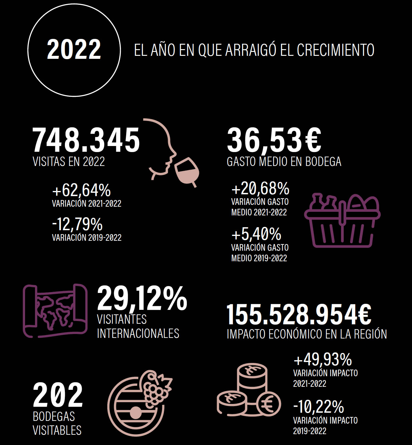 En conjunto, el impacto global del enoturismo en Rioja fue de 155.528.954 millones de euros, casi un 50% (49,93%) más que en 2021, generando valor tanto para las bodegas de la Denominación y la propia región, como para el resto del ecosistema turístico y enoturístico español.