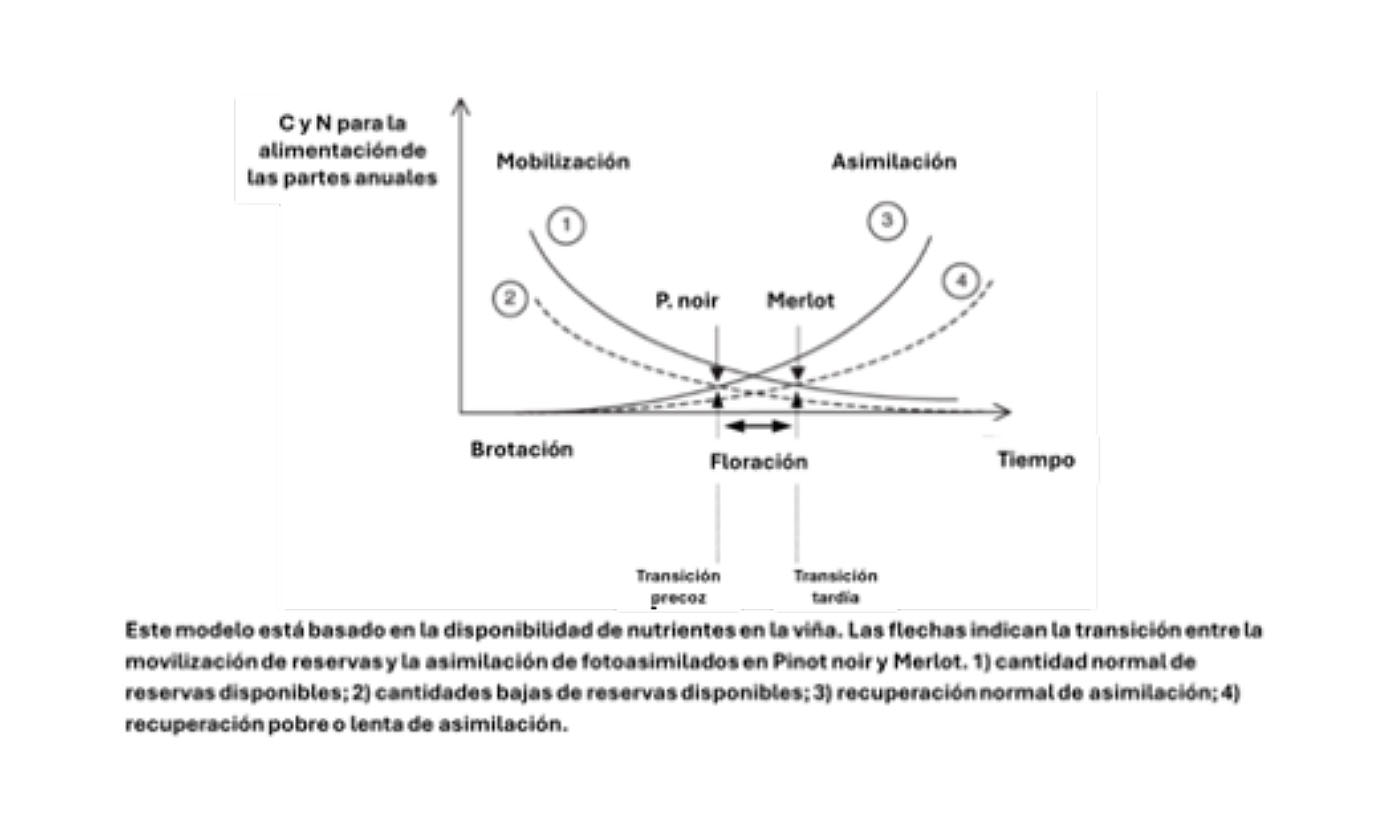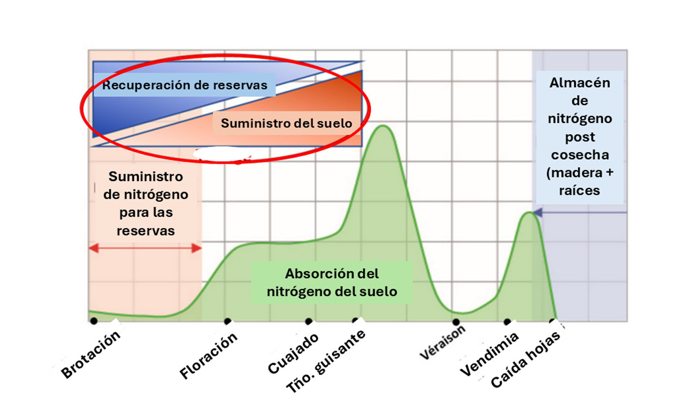Por lo tanto, la acumulación de reservas será más bien baja desde la floración hasta el envero, luego más alta a partir del envero y continuará después de la cosecha hasta la caída de las hojas. Los elementos se acumulan en las partes lignificadas: madera, raíces y tronco. La dinámica de almacenamiento en la madera y en las raíces está correlacionada, por lo que el análisis de sarmientos ofrece una visión global, sin necesidad de tomar muestras de los distintos órganos de almacenamiento de la planta.