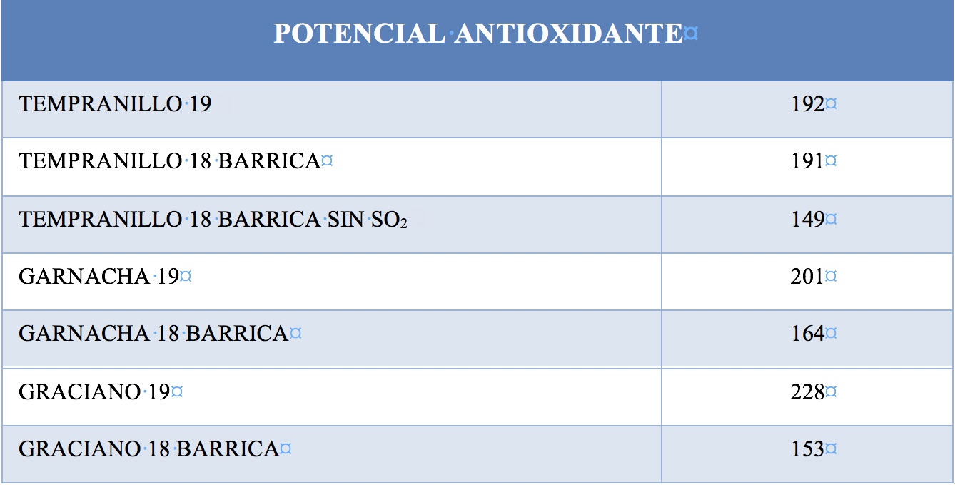 - Respecto a los vinos jóvenes, la variedad Garnacha es la más sensible a la oxidación, mientras que el Tempranillo y el Graciano tienen mayor presencia de antioxidantes, con mayor capacidad de envejecimiento, por lo tanto. Se puede deducir que la variedad de vid Graciano es la más resistente a la oxidación de las tres utilizadas en el presente estudio. Si se analizan los vinos con crianza en barrica, los resultados cambian. La variedad Garnacha es la que tiene más compuestos antioxidantes y, por lo tanto, mayor resistencia a la oxidación.