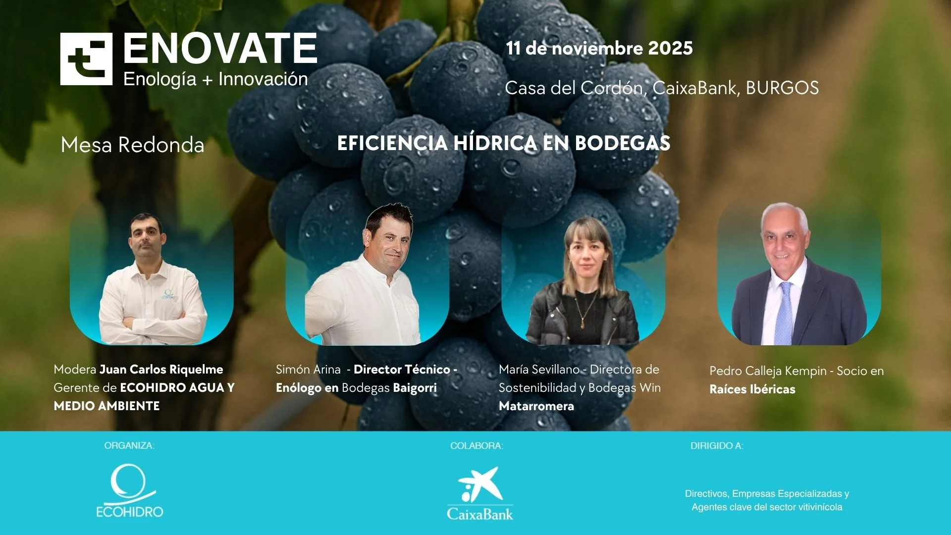 La primera mesa redonda, moderada por Juan Carlos Riquelme, gerente de ECOHIDRO, se centrará en la eficiencia hídrica como pilar de la sostenibilidad en bodegas. Participarán representantes de Bodegas Matarromera, Bodegas Raíces Ibéricas, Bodega Baigorri y Bodega Win, quienes compartirán experiencias y soluciones innovadoras en el uso responsable del agua, la optimización de procesos y la integración de tecnologías de control y monitorización.