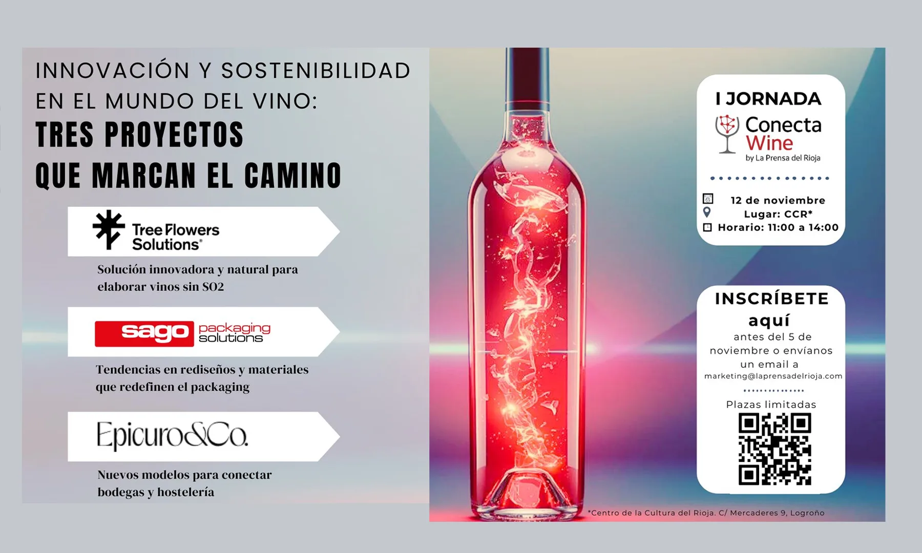 Conecta Wine by La Prensa del Rioja celebra su primera edición el 12 de noviembre en el CCR con tres empresas que marcan el camino hacia un vino más responsable, conectado y competitivo: Tree Flowers Solutions, Sago Packaging y Epicuro & Co.
