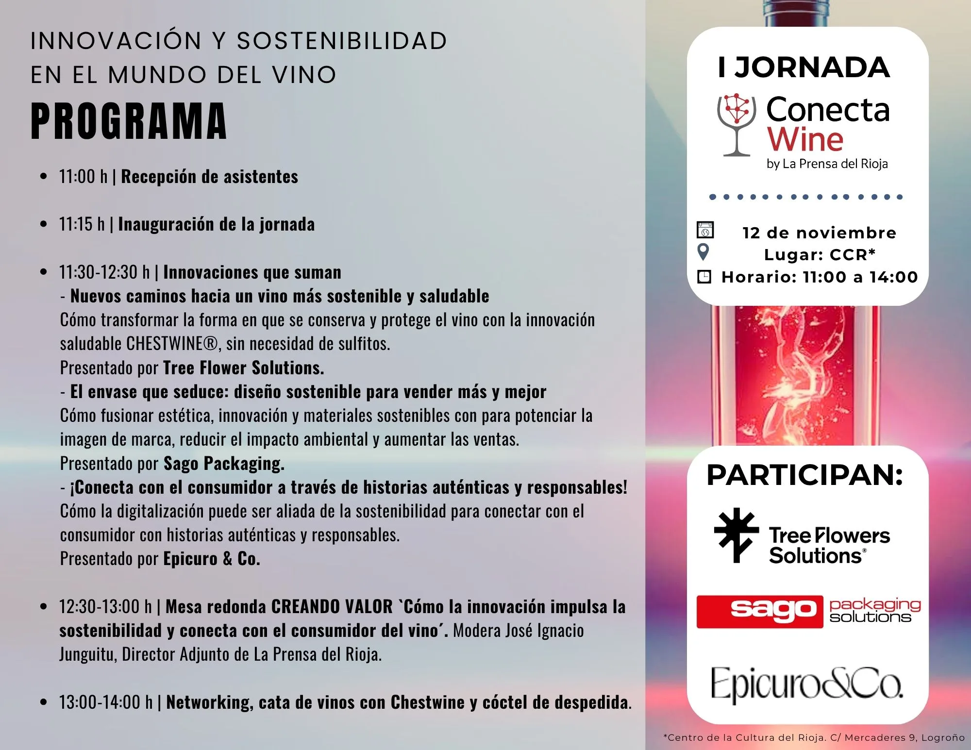 Conecta Wine by La Prensa del Rioja nace con la idea de que el vino se piensa, se comparte y se comunica, transformando la información en conversación y la comunicación en experiencia compartida. La primera edición, bajo el lema “Innovación y sostenibilidad en el mundo del vino”, se celebrará durante la mañana del 12 de noviembre en el Centro de la Cultura del Rioja (CCR), y reunirá a tres empresas que están liderando el cambio en el sector: Tree Flowers Solutions, Sago Packaging y Epicuro & Co.