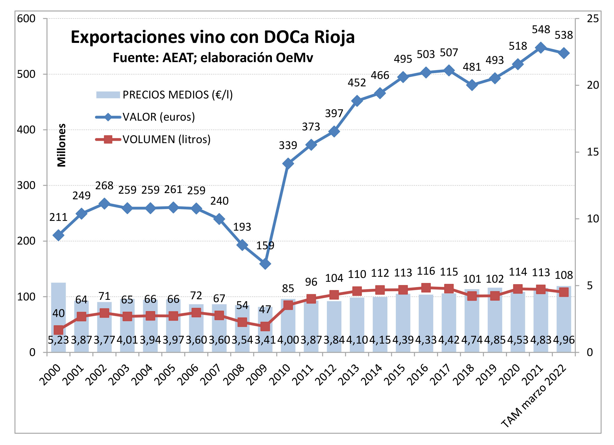 Según datos de las AEAT, analizados por el Observatorio Español del Mercado del Vino (OeMv), las exportaciones de vinos con DOCa Rioja llegaron al interanual a marzo de 2022 (doce meses comprendidos entre abril de 2021 y marzo de 2022) con crecimiento de su facturación del +4%, hasta alcanzar los 538 millones €, que suponen 21,4 millones € más que en el mismo periodo de 2021. Este aumento de la facturación se produce gracias a una revalorización de los vinos con DOCa Rioja en el comercio mundial (+9%), situándose en el interanual a marzo de 2022, en los 4,96 €/litro. En términos de volumen, sin embargo, se registró una caída del 4,8%, hasta los 108,4 millones de litros, que suponen 5,4 millones de litros menos que en 2020.
