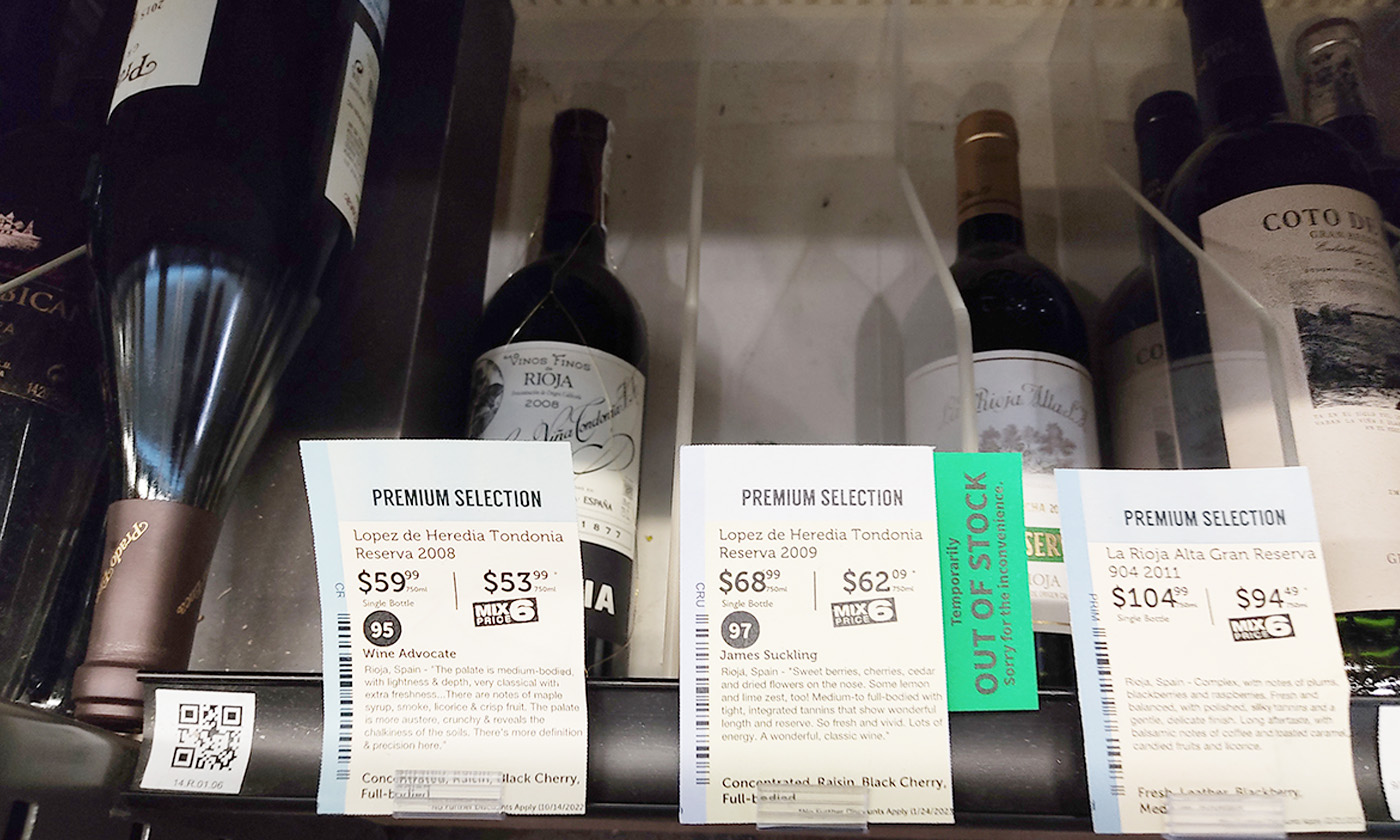 Por referirme a las marcas de la Denominación de Origen Calificada, nos encontramos con diferentes vinos de López de Heredia -si bien su Reserva 2009 advierten de que temporalmente estaba fuera de stock, al tiempo de pedir disculpas por la inconveniencia, un vino, por cierto, valorado en 68,99 dólares-, Marqués de Riscal, Viña Ardanza, Faustino, Marqués de Cáceres, Muga, CVNE, Viña Pomal, Campo Viejo, Finca la Montesa, Ramírez de Piscina, Beronia, Eguren Ugarte, Castillo Clavijo, El Coto, Valserrano, La Rioja Alta, Montecillo, Vinsacro, Marqués de la Concordia… y todos en diferentes categorías de crianza, reserva o gran reserva pero con diferentes tipos de uvas, desde el tempranillo a la garnacha, pasando por el mazuelo, pero sin olvidar los blancos. En cuanto al precio, varían mucho por la calidad de los vinos, aunque puedes llevarte a casa una botella de crianza de Rioja entre 16 y 20 dólares; los reserva, no por menos de 30 dólares y los vinos gran reserva, o especiales, el dinero que quieras pagar desde los 36 dólares… pero con una rebaja si te llevas 6 botellas, por norma general, de 2 o 3 dólares por botella, a lo que debemos añadir a todos, el que es de un 10,50 %.