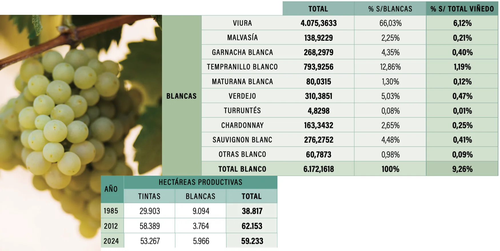 En conjunto, el viñedo blanco supera hoy las 5.900 hectáreas, cerca del 9 % de la superficie total de la denominación, distribuyéndose especialmente en las zonas más frescas, donde el clima y los suelos favorecen vinos con buena acidez y capacidad de evolución.