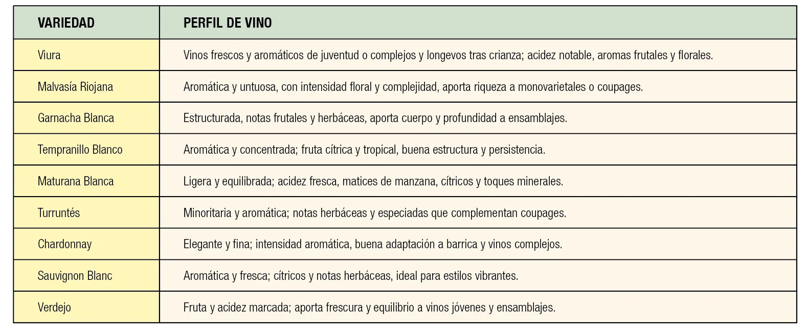 A su lado han ido ganando protagonismo otras variedades autóctonas que enriquecen el paisaje vitícola. Entre ellas destaca la Tempranillo Blanco, una mutación natural del tempranillo tinto descubierta en 1988 en Rioja, hoy considerada una de las apuestas más interesantes por su intensidad aromática y potencial de guarda. Junto a ella, la Malvasía Riojana y la Garnacha Blanca aportan textura, complejidad aromática y estructura a muchos ensamblajes. Completa el grupo de autóctonas la minoritaria Maturana Blanca y la escasa Turruntés, recuperadas del patrimonio genético riojano, valoradas por matices cítricos, especiados o minerales. A estas se suman tres variedades internacionales —Chardonnay, Sauvignon Blanc y Verdejo— cuya presencia es menor, pero que amplía el abanico de estilos dentro de la denominación.
